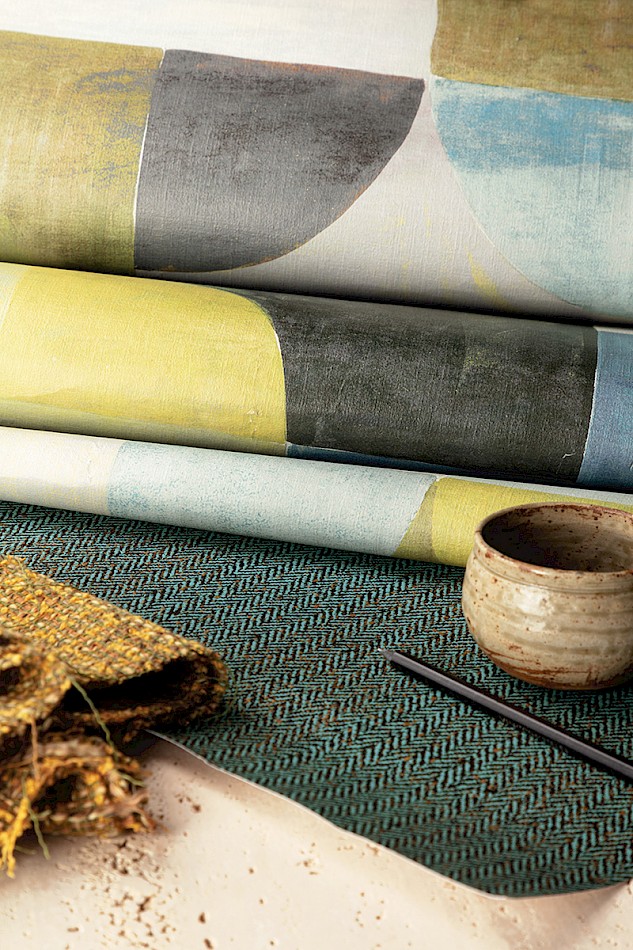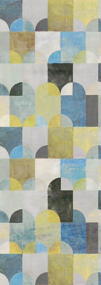 Behang Arc haalt zijn inspiratie uit het landschap in Sobborgo. De huizen en bomen worden geabstraheerd tot eenvoudige vormen en schetsen een complex geheel dankzij de vele kleurcombinaties.