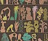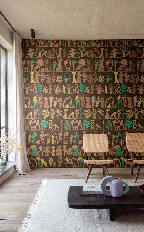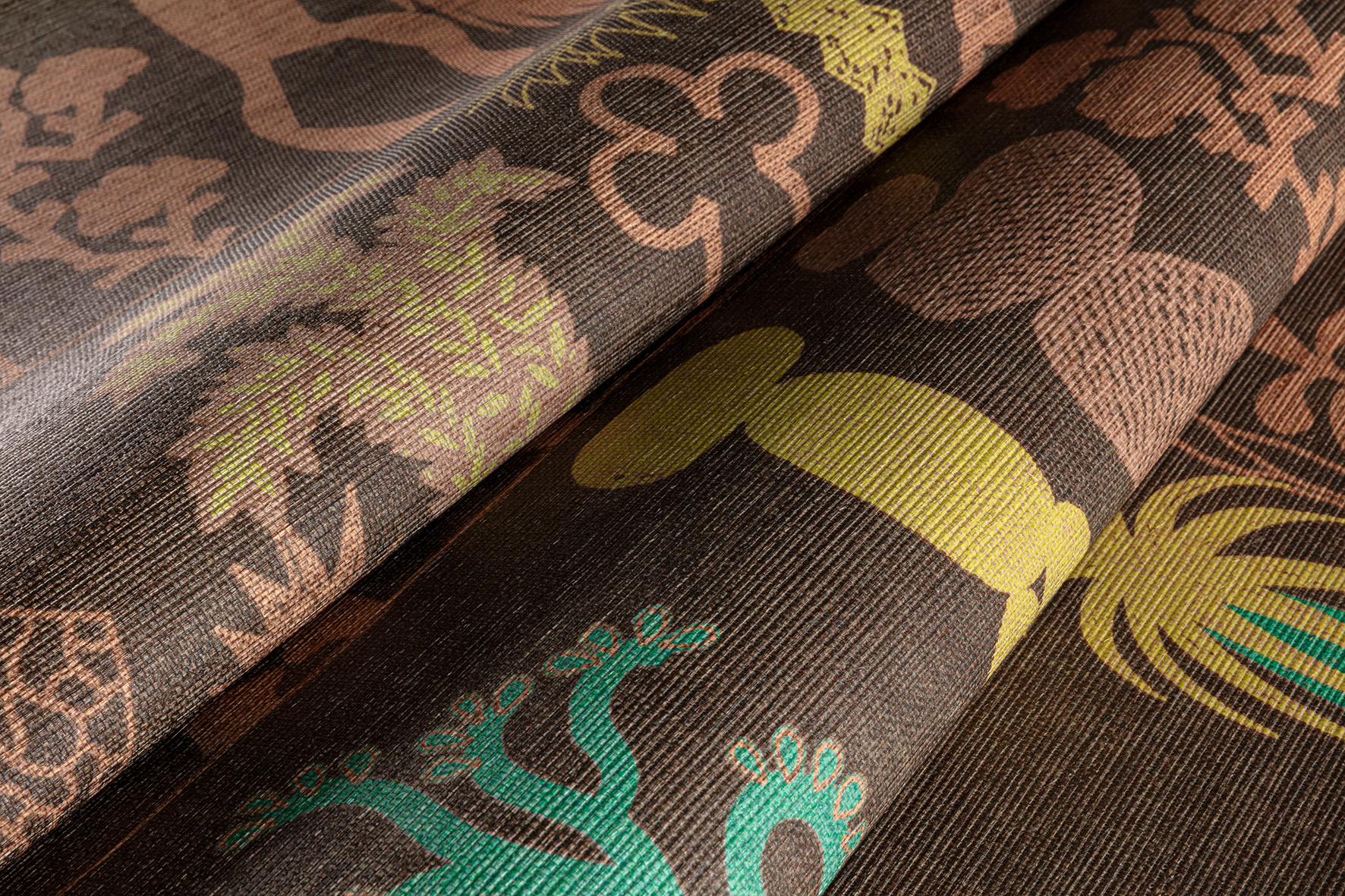 Uitgesneden stukken textiel en papier zijn hier gelijmd op een textiele basis. Het toegevoegde borduurwerk en de verf scheppen speciale effecten en een driedimensionaal gevoel. Geïnspireerd op de decoupagekunst van Matisse en de gekke, decoratieve elementen van Baya, toont het behang Gaudia ons een mix van verschillende technieken en structuren. De textiele print versterkt het effect van de sisal waarop het ontwerp is afgedrukt.