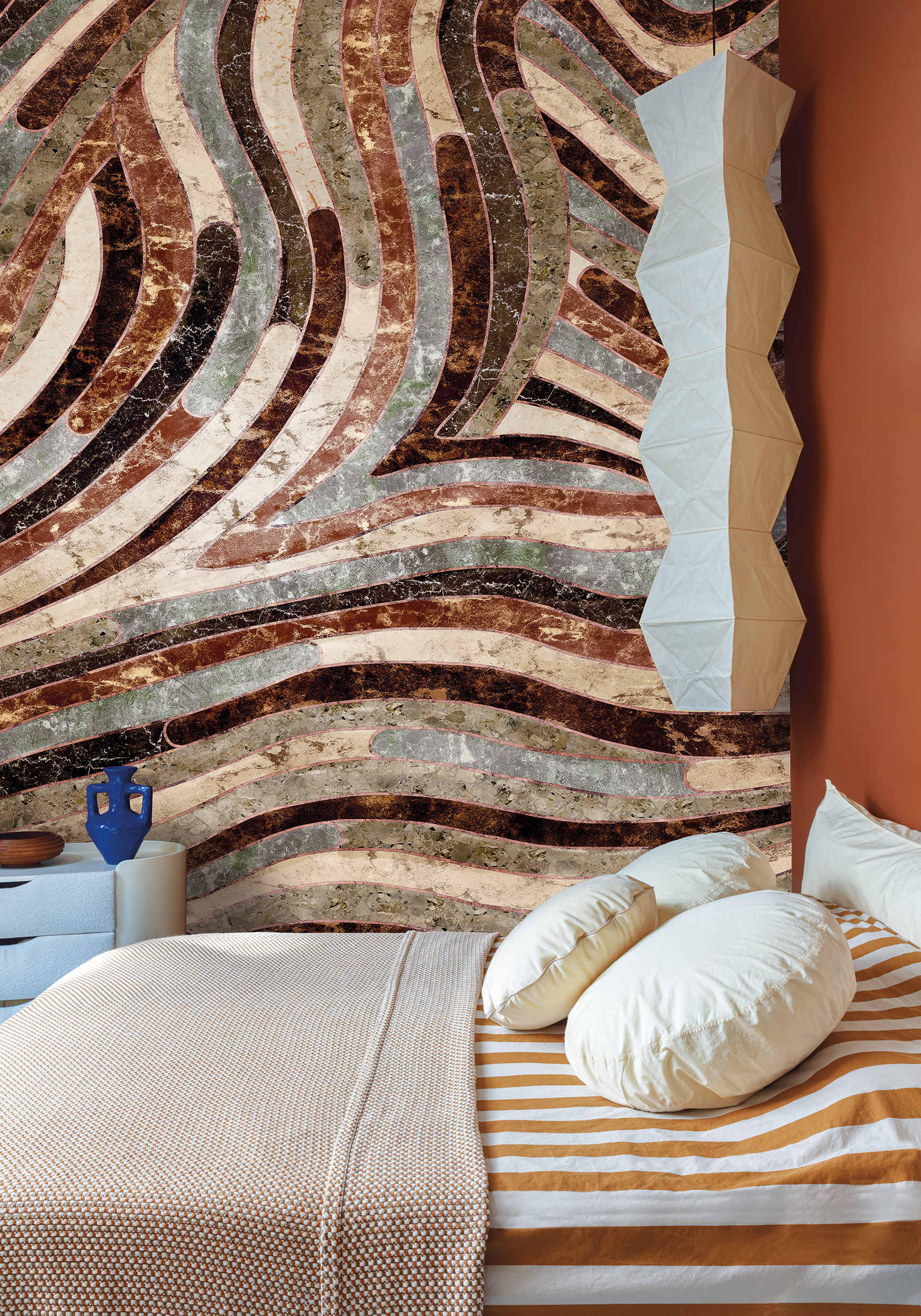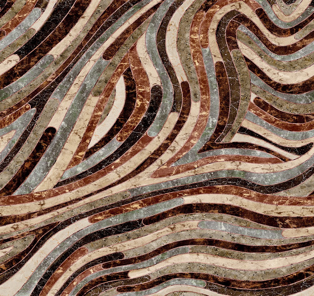 Het panoramische behang Serpentine is als een fantastisch monumentaal werk van ingelegde marmersoorten. De slingerende, golvende beweging verzacht de koelheid van de steeneffecten en maakt het geheel sensueel vloeiend en warm.