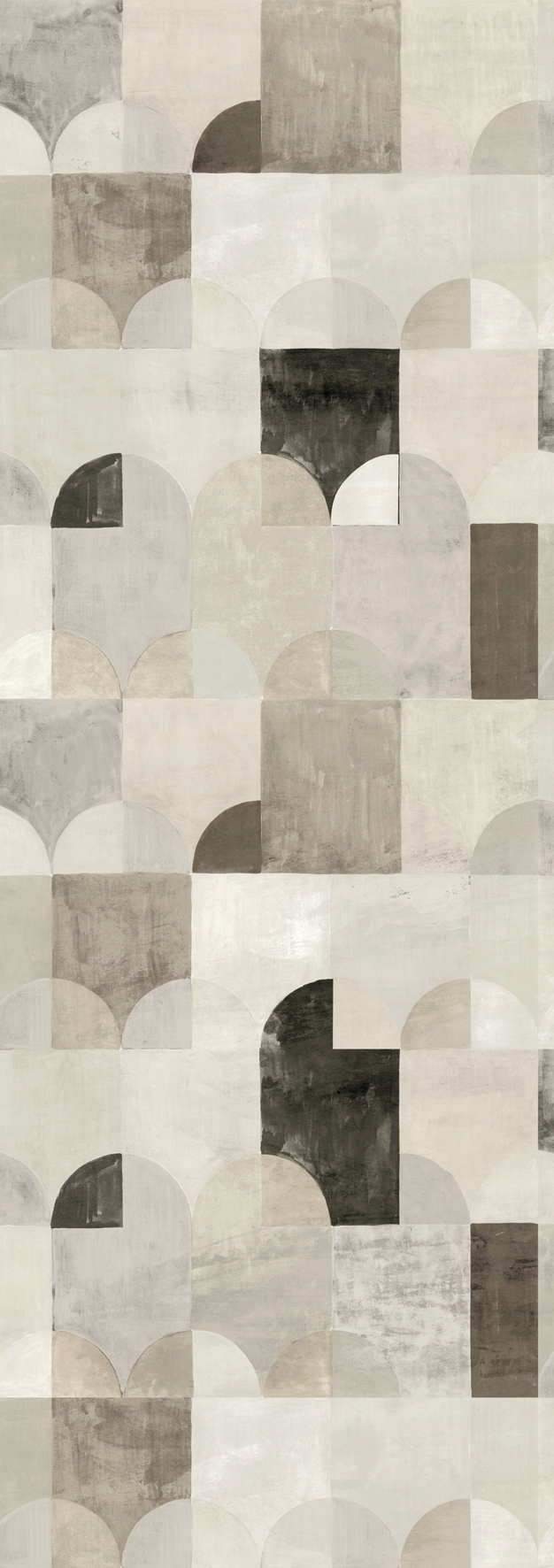 Die Tapete Arc ist von der Landschaft in Sobborgo inspiriert. Die Häuser und Bäume wurden zu einfachen Formen abstrahiert und bilden dank der vielen Farbkombinationen ein komplexes Ganzes.