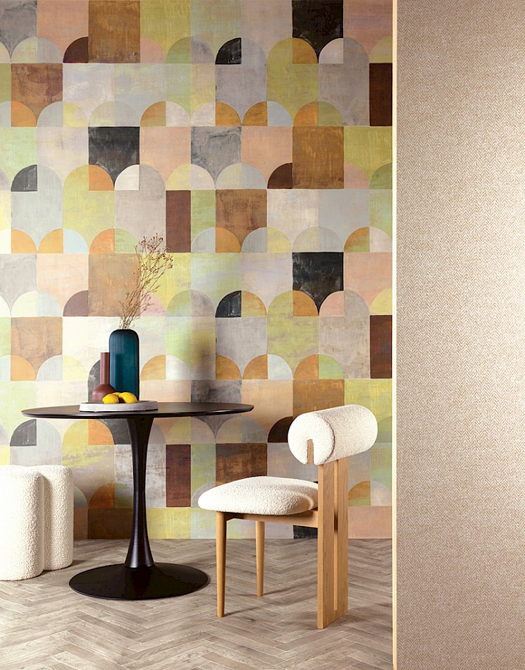 Our Arc wallpaper takes inspiration from the beautiful Sobborgo landscape. Houses and trees are treated as abstract subjects, morphed into simple shapes whose endless colour combinations make for an intricate overall composition.