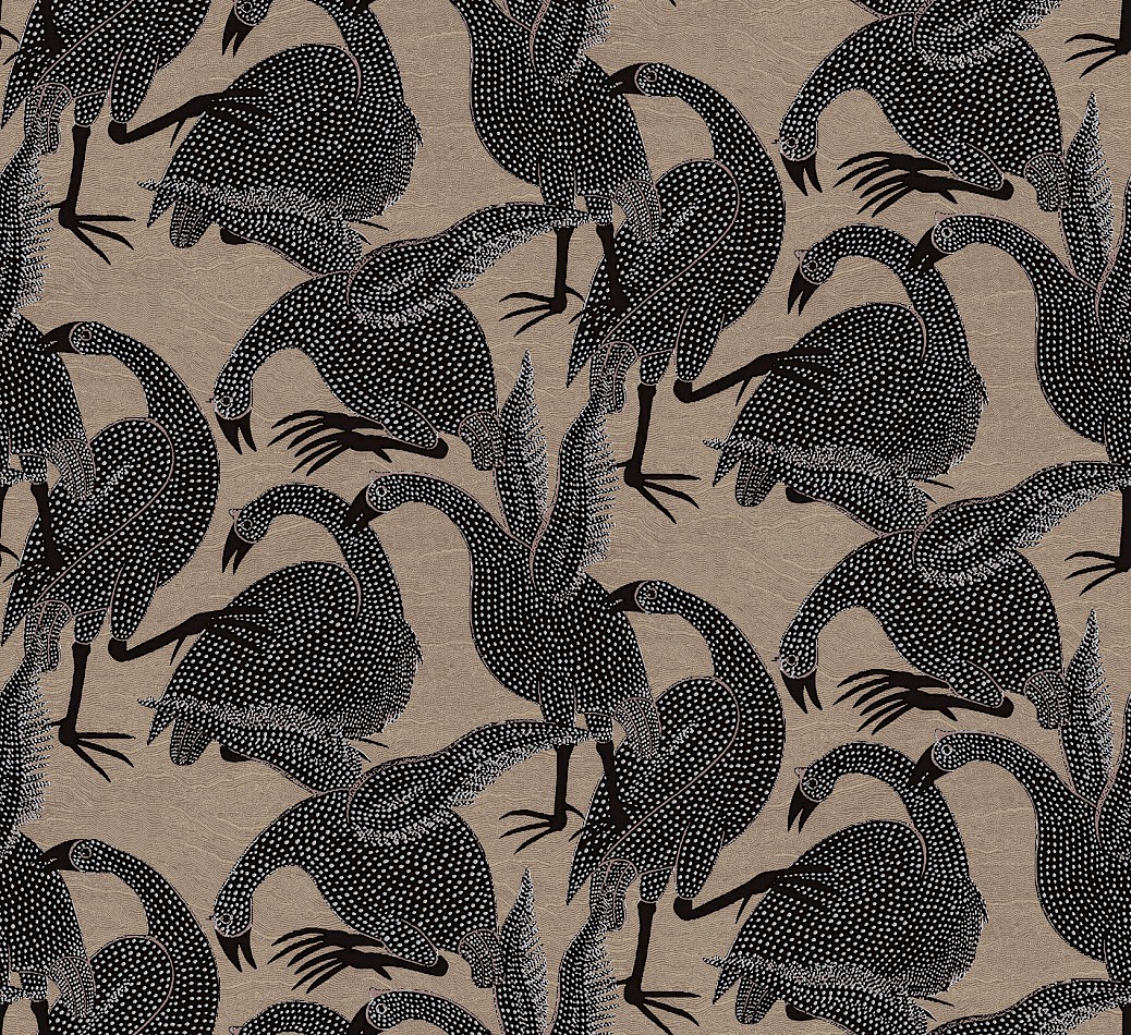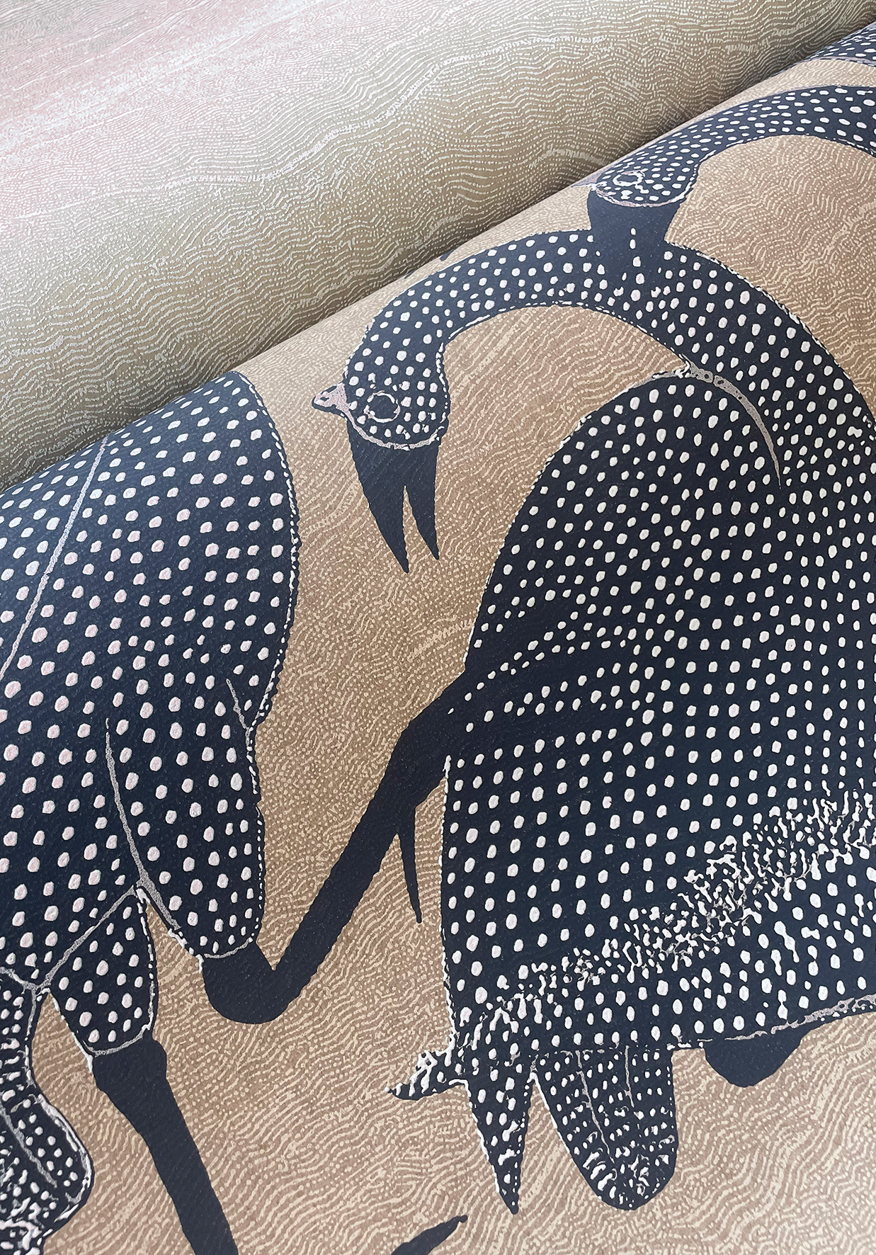 Le design Guinea nous entraîne dans l’univers de pintades batifolant et étirant leurs ailes sur un fond couleur argile. Si elles ne passent pas inaperçues, c’est de manière esthétique avec une touche d’humour.